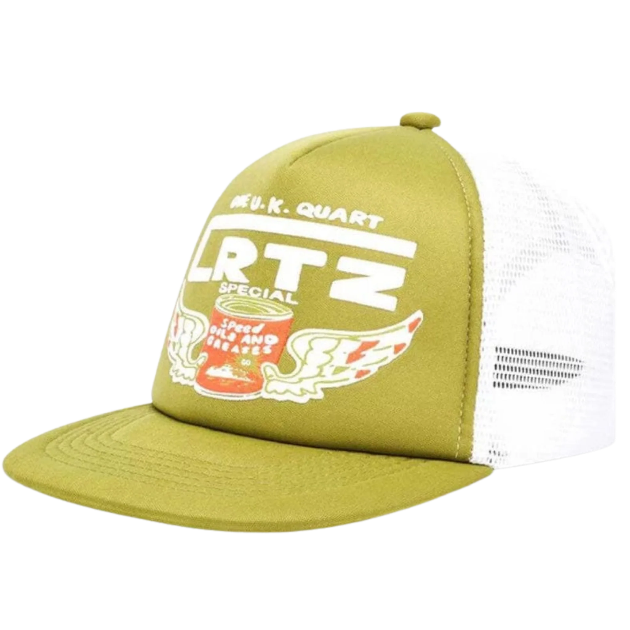 Ten model to ukłon w stronę estetyki wyścigowej i starych warsztatów samochodowych. Oliwkowa zieleń frontu i daszka idealnie współgra z białą siatką, tworząc spójną całość. Główną rolę gra tu duża, haftowana grafika "Speed Oils and Greases" z motywem puszki oleju i skrzydeł. Wyrazisty design nawiązuje do kultury vintage i wyróżnia ten model na tle klasycznych logówek.