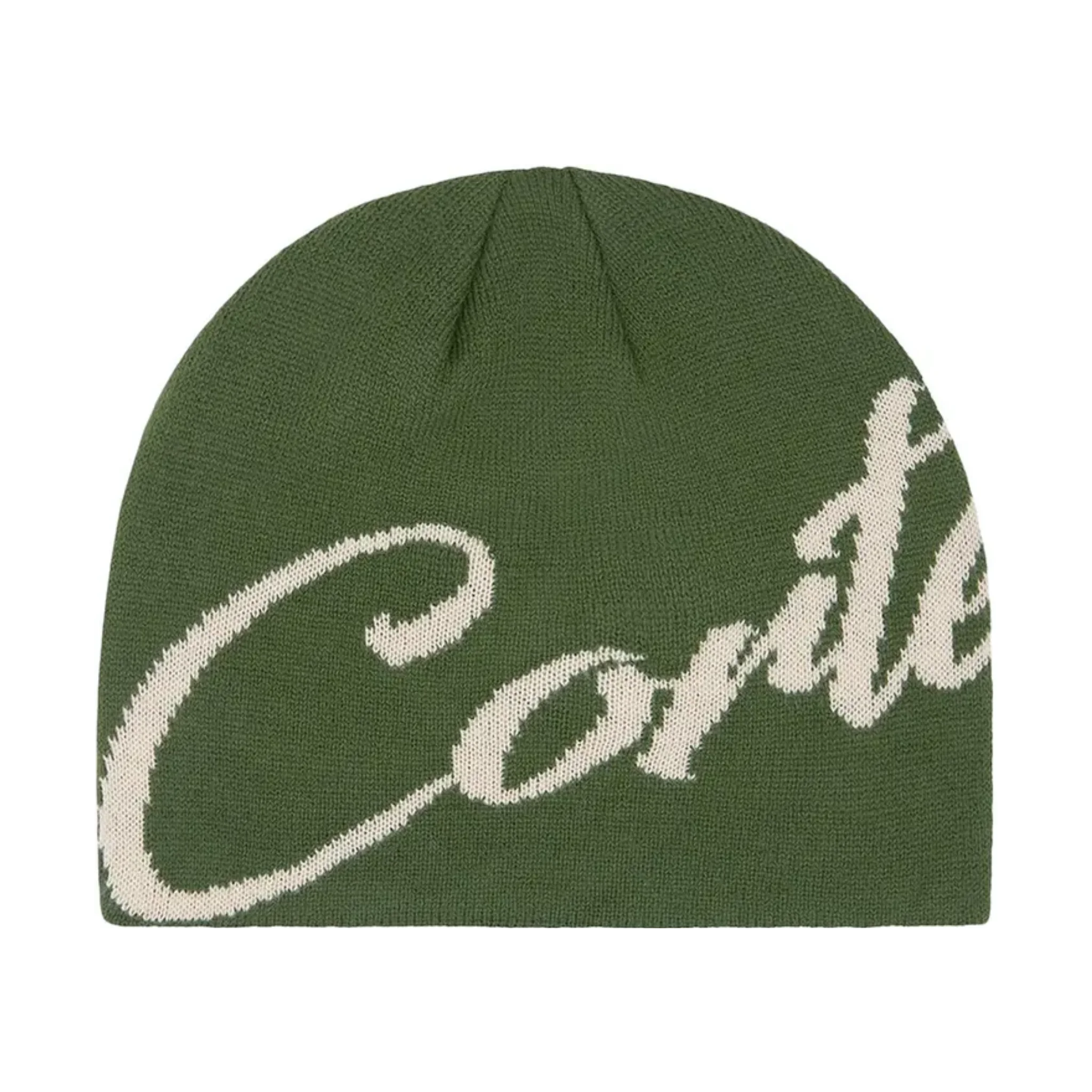 Beanie w odcieniu butelkowej zieleni z kontrastowym, kremowym logo. To połączenie kolorystyczne jest niezwykle modne i pasuje do większości jesienno-zimowych kurtek. Duży napis "Corteiz" wykonany techniką żakardową jest trwały i czytelny. Komfort na co dzień zapewnia miękki materiał, który nie gryzie w czoło.