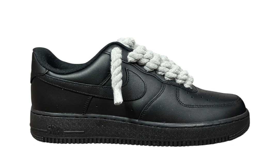 Nike Air Force 1 Black Rope Grey to klasyczne, czarne Air Force 1 custom z charakterystycznym, grubym rope laces w kolorze szarym. Ten subtelny detal zmienia odbiór całego modelu – dodaje mu elegancji i nowoczesnego tonu, zachowując przy tym surowy, streetwearowy vibe.