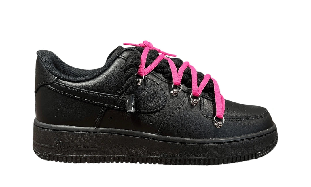 Nike Air Force 1 Double Rope Laces Black Fuschia Pink to mocny Air Force 1 custom z podwójnym sznurowaniem. Grube rope laces w kolorze black połączone z dodatkową sznurówką fuschia pink dają wyrazisty, fashion-forward efekt bez utraty klasycznej sylwetki AF1.