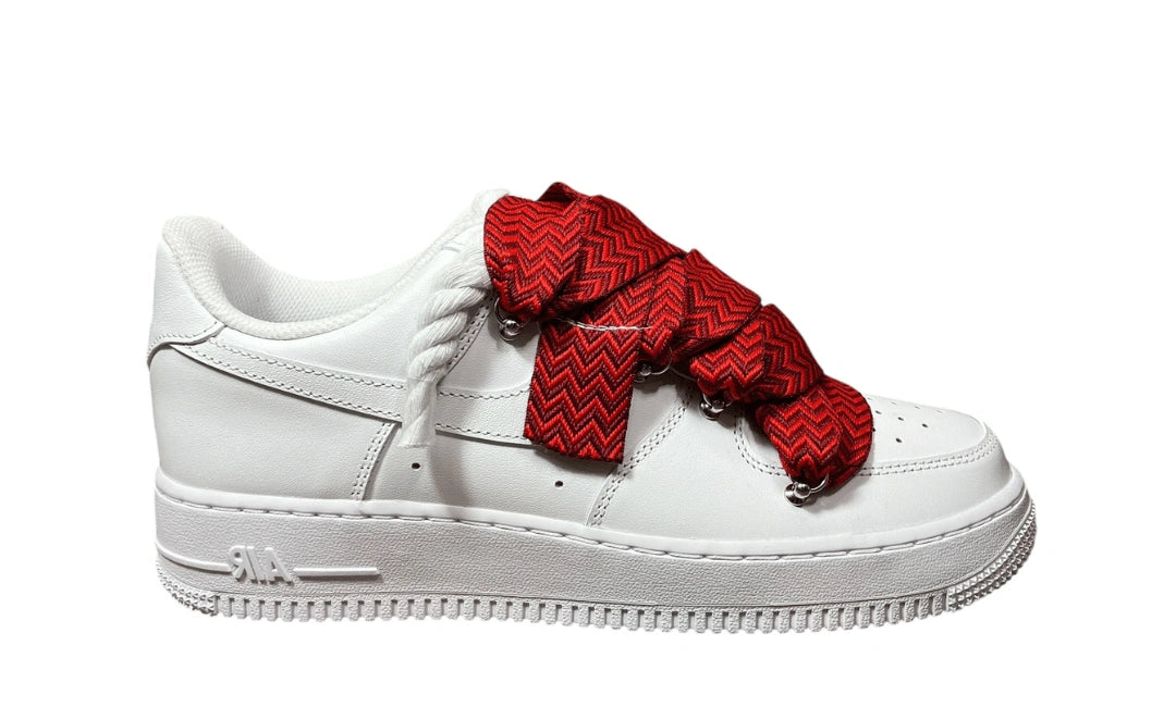 - Modowy akcent – Lanvin rope red ożywia klasyczną, białą sylwetkę Air Force 1.