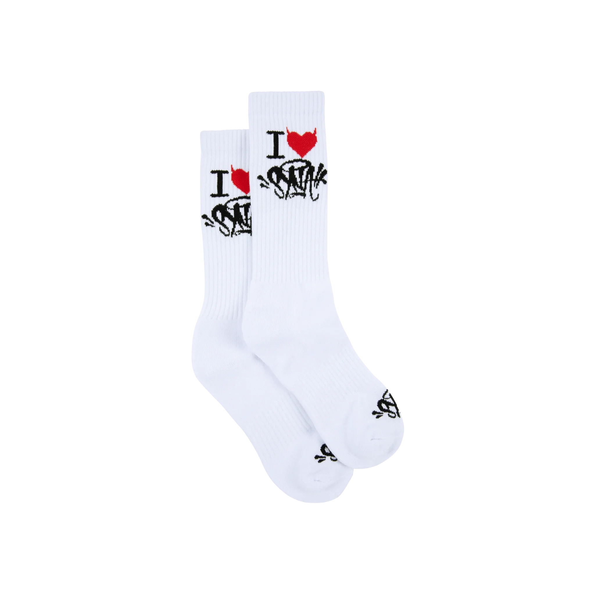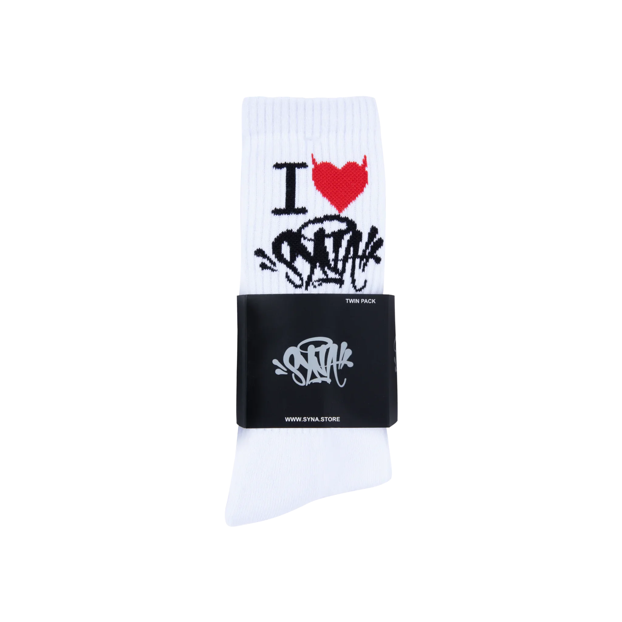 Dwupak białych skarpetek z kolekcji "I Love Syna". Klasyczna, prążkowana skarpeta sportowa została podkręcona grafiką czerwonego serca i czarnego logo graffiti. To drobny detal, który zmienia cały outfit.
