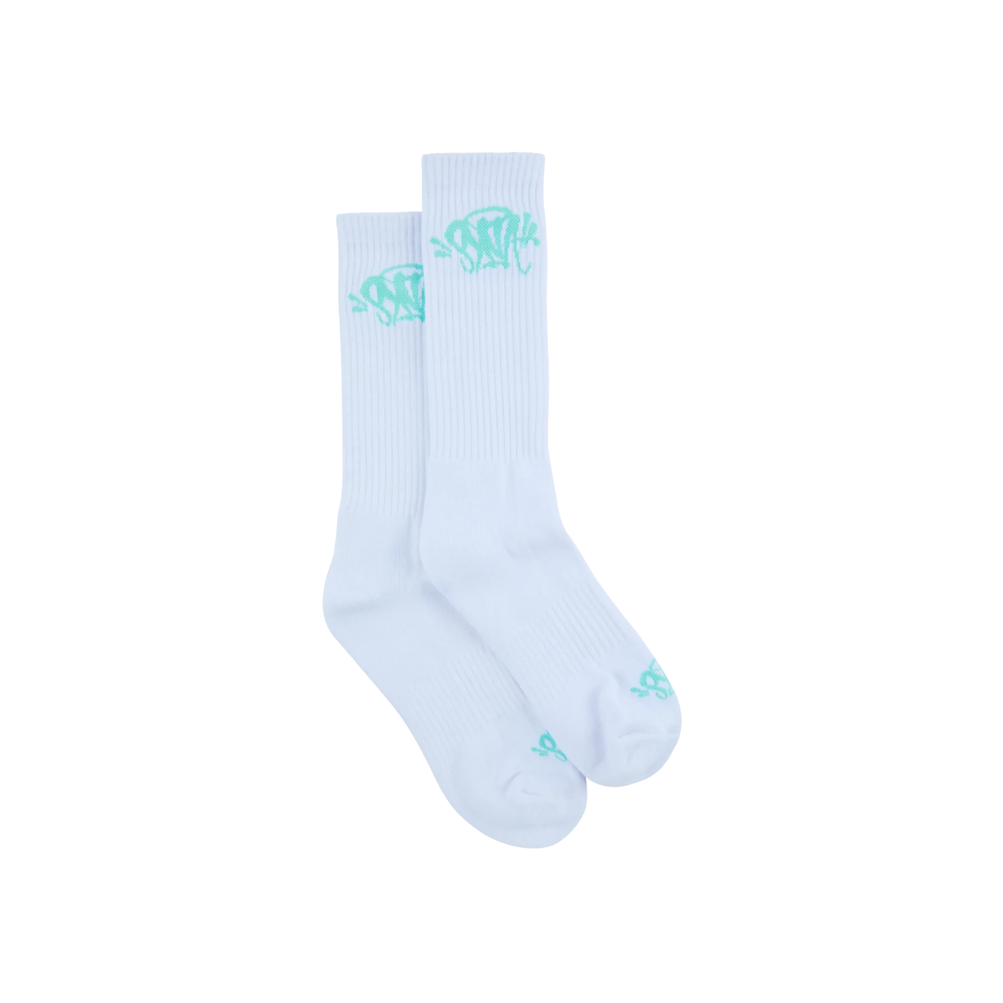 Białe skarpetki z wyjątkowym logo w kolorze Araba Blue. Ten odcień niebieskiego jest świeży i energetyczny, idealnie pasując do letnich stylizacji. Czysta biel materiału wygląda schludnie i nowocześnie.