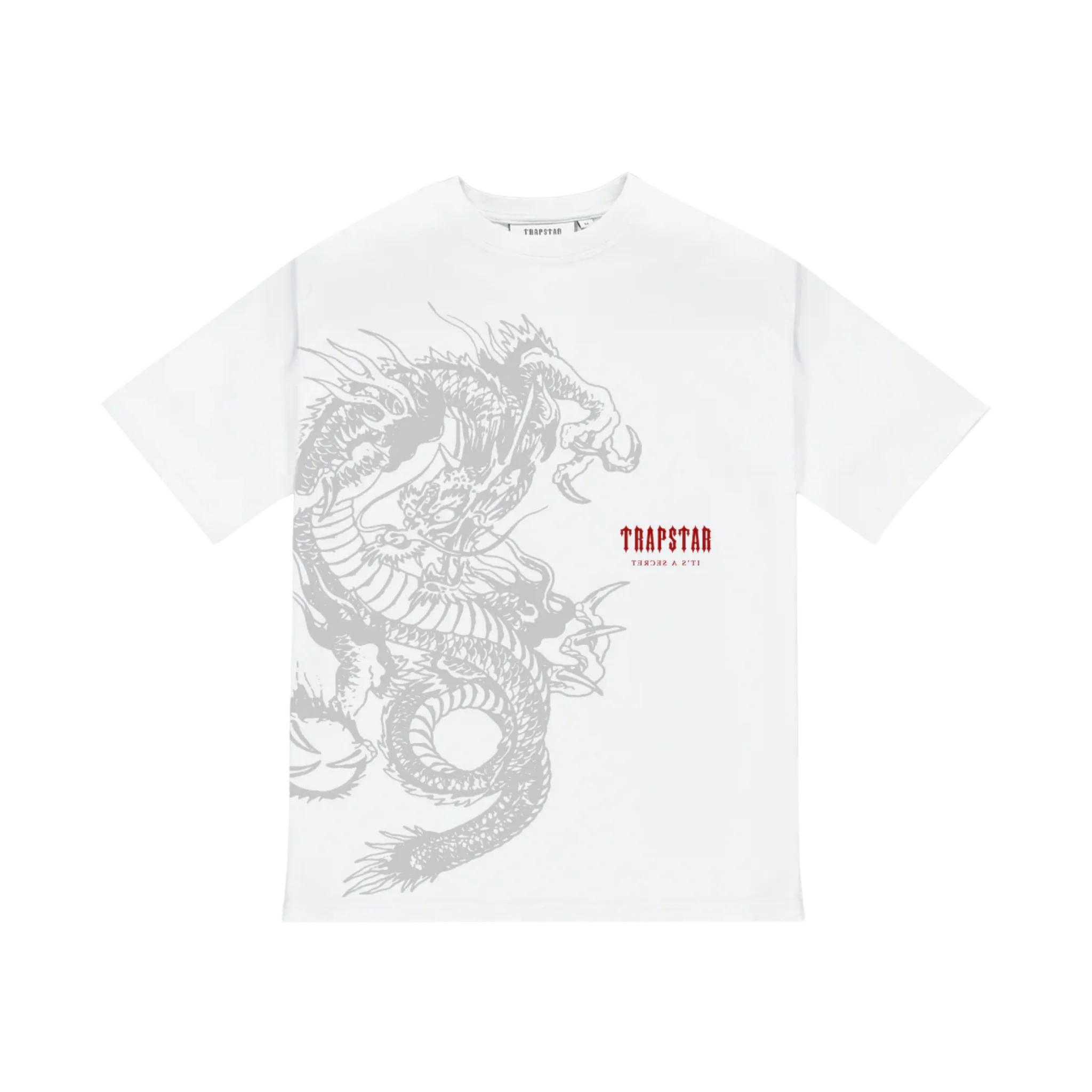 Inspiracja kulturą azjatycką w londyńskim wydaniu. Biała koszulka z potężnym, szarym nadrukiem smoka, który oplata bok sylwetki. Detal w postaci czerwonego, gotyckiego logo Trapstar dodaje całości agresywnego charakteru i stanowi mocny kontrast. Streetwearowy vibe miesza się tu z artystyczną grafiką.