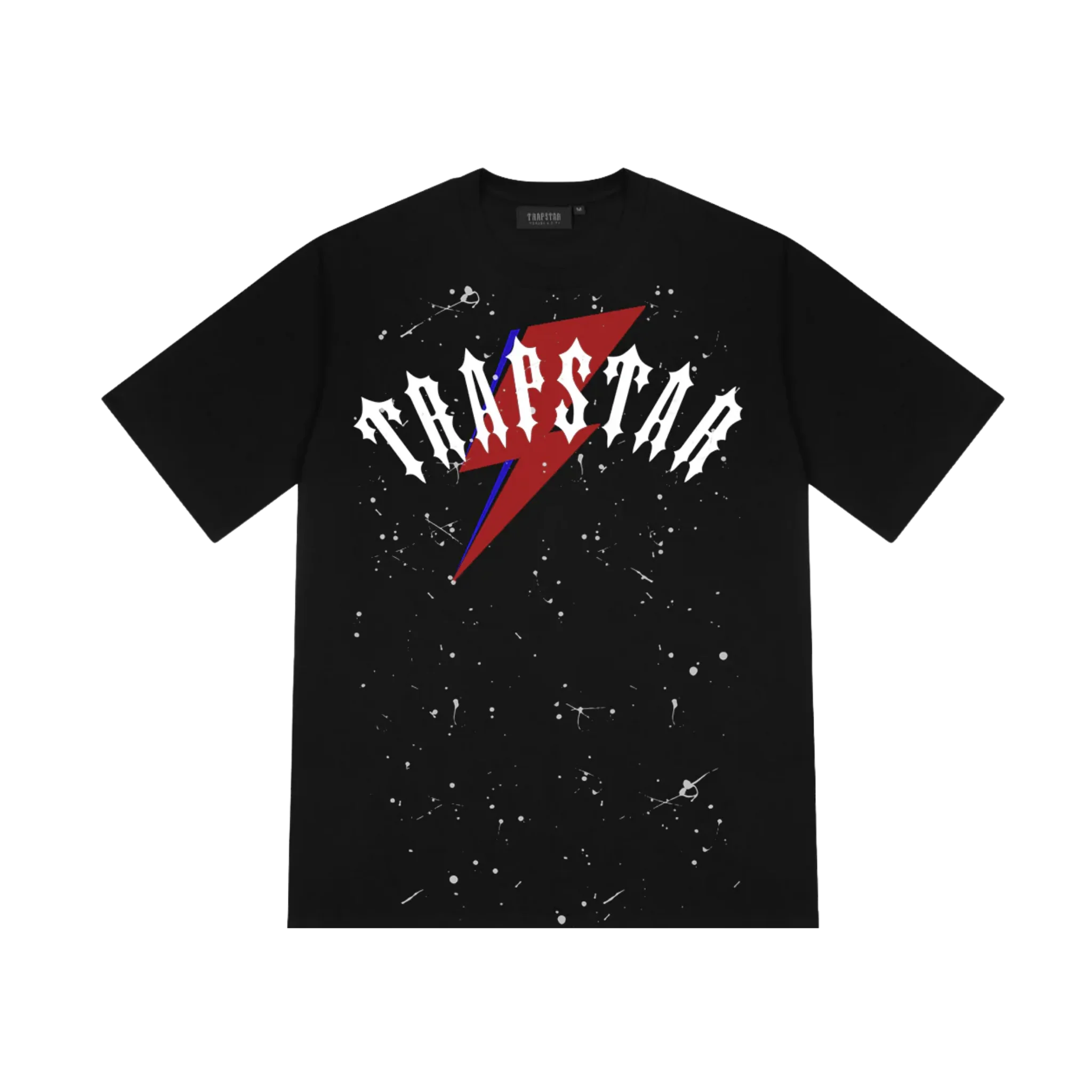 Czarna koszulka z motywem "Flash". Grafika oparta na symbolu błyskawicy i dynamicznej typografii Trapstar. Energetyczny wzór, który ożywia klasyczną czerń.
