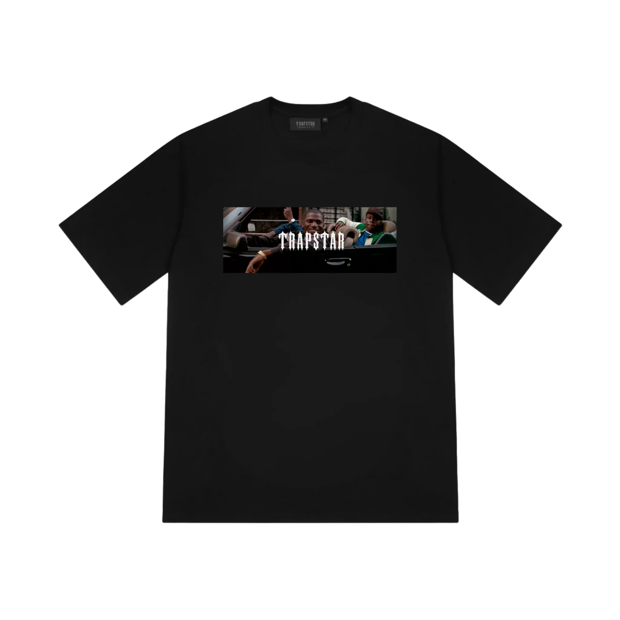 Czarna koszulka z nadrukiem typu "photo tee", przedstawiającym kadr filmowy z kultowym vibem hustlerki. Na zdjęcie nałożono gotyckie logo Trapstar w kolorze białym. Grafika jest nasycona i pełna detali, tworząc atmosferę rodem z kina akcji lat 90. Wyrazisty design opowiada historię sukcesu i walki o swoje.