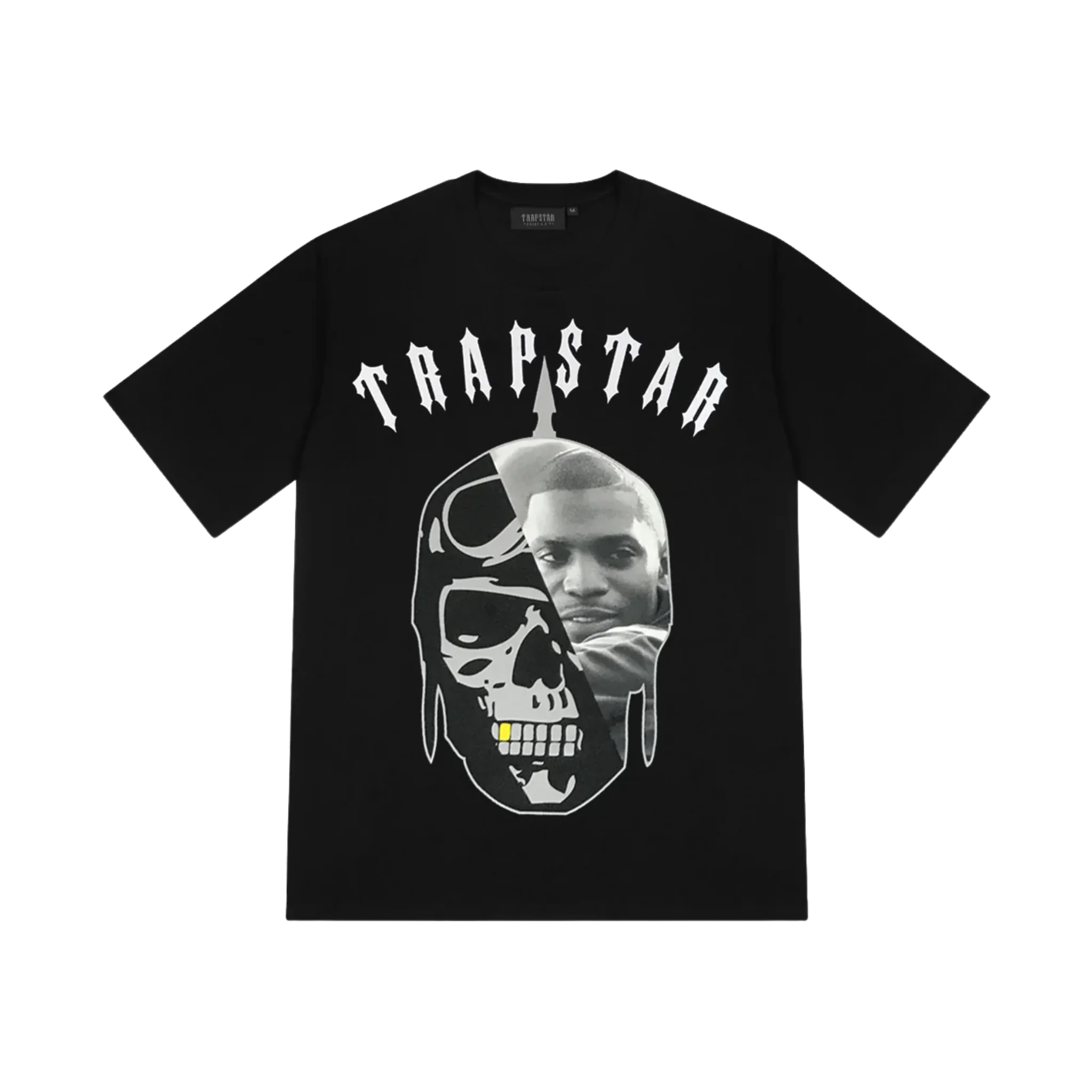 Czarna koszulka z intrygującą grafiką "Hustler's Spirit". Nadruk przedstawia czaszkę w kasku pilota połączoną z twarzą, co symbolizuje determinację i dążenie do celu. Nad całością góruje gotycki napis Trapstar.