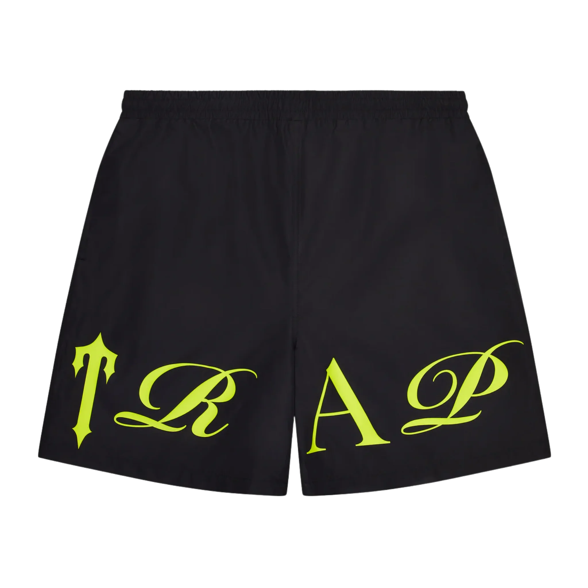 Czarne spodenki wykonane z lekkiego materiału typu shell. Kontrastowe logo "Trapstar Script" w kolorze Slime Green (neonowa zieleń) dodaje im sportowego, dynamicznego charakteru. Idealne na basen, plażę czy na miasto.