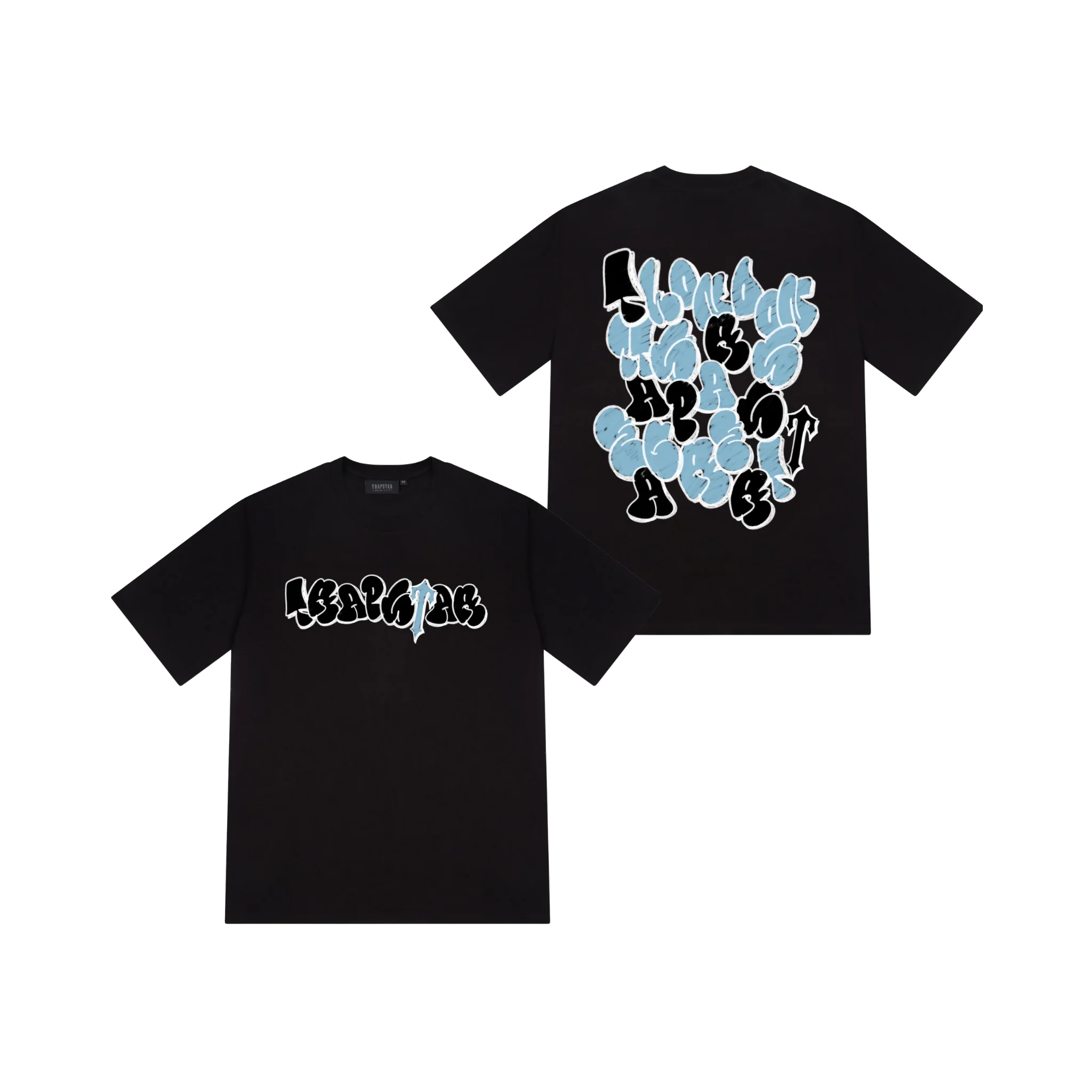 Czarna koszulka z grafiką "Wall to Wall". Motyw ten często nawiązuje do graffiti i miejskiej przestrzeni, pokrywając plecy lub front wyrazistym brandingiem. Mroczna estetyka typowa dla Trapstar.